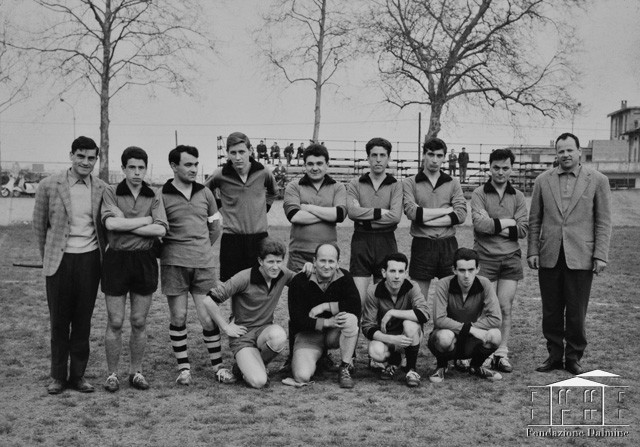 Angelo Facoetti con la squadra del reparto attrezzeria al torneo di calcio aziendale. 7 aprile 1965