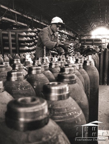 Operatore al lavoro nel reparto bombole. Anni '70