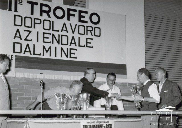 Premiazione del torneo nazionale di bocce a coppie del 2° Trofeo dopolavoro aziendale. Anni '70